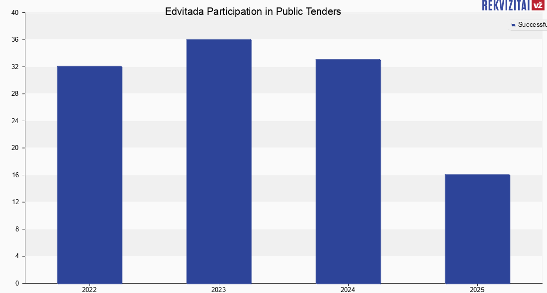 In 2022, Edvitada, UAB, secured victories in 32 public tenders as a supplier. The following year, in 2023, the company was successful in winning 36 public tenders. The following year, in 2024, the company was successful in winning 33 public tenders. The following year, in 2025, the company was successful in winning 16 public tenders. It is important to note that we exclusively disclose information pertaining to successfully won public tender competitions.